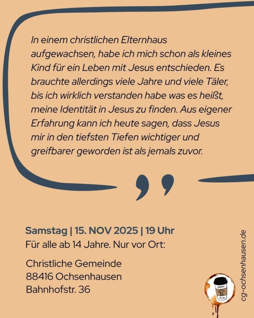 Das Jugendcafé ,,Christ to go“ bietet neben Kaffee und Snacks auch jedes Mal viel Inhalt an: Verschiedene Personen erzählen aus Ihrem Leben und welche Rolle Gott darin spielt. Bei gemütlichem Kaffeeklatsch und guten Gesprächen kann der Abend dann entspannt auslaufen. Die Veranstaltung ist für junge genauso wie junggebliebene Leute. Ihr seid immer herzlich Willkommen!